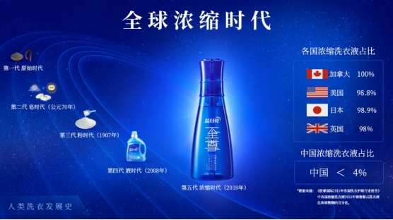 早在2019年,发达国家液体洗涤剂浓缩化率就已高达98%以上,而彼时中国浓缩洗衣液市场占比仅4%。在开放环境下,浓缩洗衣液在中国市场中得到推广和认可是一个必然的机制。回顾此前,当多数品牌仍以“瓶大量大”为卖点时,蓝月亮率先开启“浓缩+”破局,先推动“粉转液”的第一次跃迁,又再一次实现“液转浓缩”的跨越,每一次进阶都精准踏中洗衣液市场发展的转折点之上。