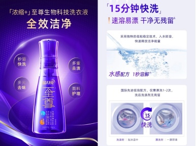 若说蓝月亮的经典大蓝瓶是打破国人固有洗衣习惯的开山之作,那“浓缩+”系列,则是蓝月亮潜心研发多年开拓浓缩蓝海市场的集大成品。2024年8月,蓝月亮又全新推出至尊生物科技洗衣液(全效洁净),全效至尊不仅拥有秒溶快洗、多元去味、除螨抑菌等功效,其特含的多重活性酶,还能深度洗去奶渍、口水渍、淀粉渍等肉眼看不见的污渍。此外还兼具防发黄、防发灰、保质感的能力,从而令白衣洁白,彩衣鲜艳。通过添加面料整理因子,全效至尊能够保护速干衣的速干性能,为用户带来干爽舒适的穿衣体验。