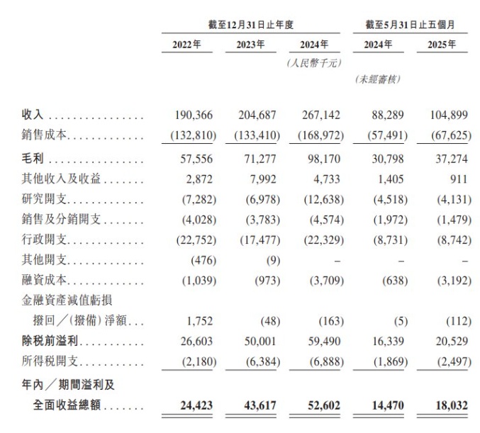 财务方面,于2022年度、2023年度、2024年度、2024年以及2025年截至5月31日止五个月(以下简称:报告期内,下同),金岩高新分别实现收入约为1.90亿元(单位:人民币,下同)、2.05亿元、2.67亿元、1.05亿元,年内/期间溢利及全面收益总额分别为2442.3万元、4361.7万元、5260.2万元及1803.2万元。