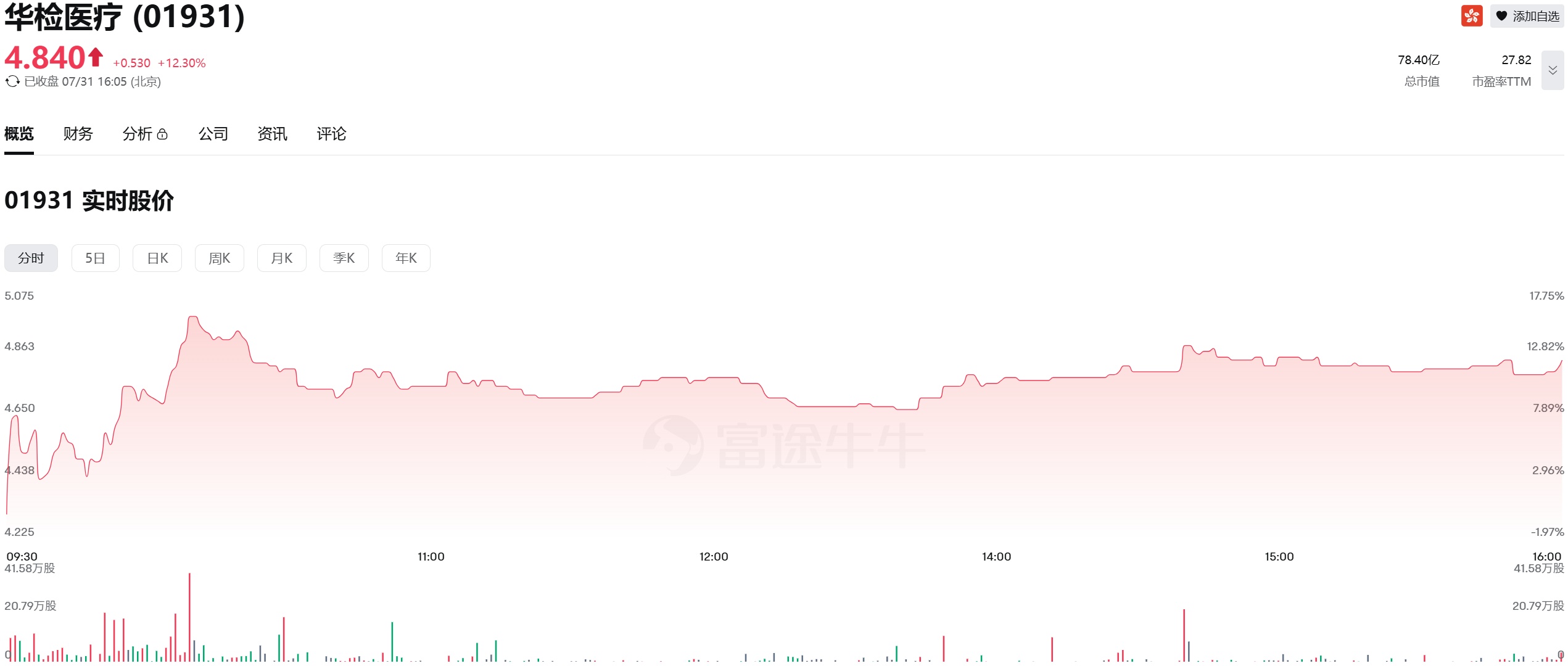 智通财经APP获悉,7月31日上午10点10分,华检医疗(01931)股价冲到4.99港元,单日涨幅达15.78%。从7月2日开盘的2.22港元/股,到7月31收盘报价4.84元/股,涨幅达到118%。资本市场的狂热源自这家公司过去半个月的连环动作——从7月14日宣布赴美双重主要上市,到7月30日发布全新品牌LOGO,七大战略行动如火箭推进器般将市值从36亿推至近80亿港元。