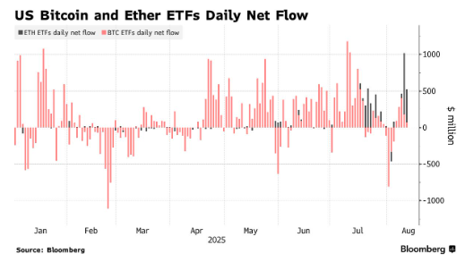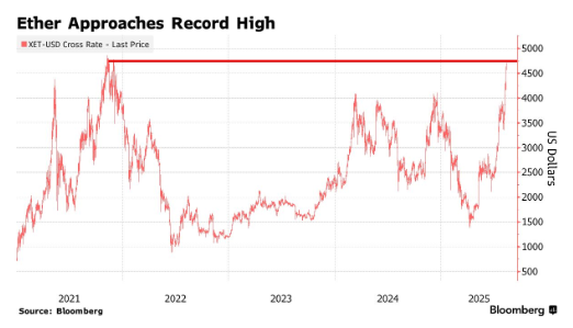 以太币此番上涨得益于两大驱动力:直接投资该代币的基金创纪录的资金流入,以及雨后春笋般涌现的以太坊专项财库机构——这些效仿迈克尔·塞勒比特币囤积策略的上市公司,据StrategicEthReserve.xyz统计已累计吸纳价值170亿美元的以太币。