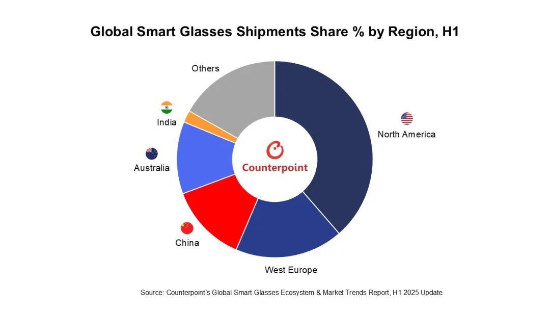 在Ray-Ban Meta AI眼镜的主导地位推动下,该产品上市的地区(例如北美、西欧和澳大利亚等)引领了全球智能眼镜的出货量增长。2025年第二季度,Meta和Luxottica将业务拓展至印度、墨西哥和阿联酋,这也提升了这些市场的出货量份额。