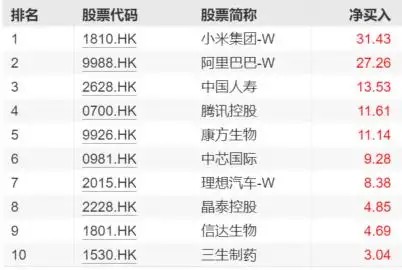 从南向资金来看,近7日,南下资金净流入靠前的10只个股中,小米集团-W、阿里巴巴-W净买入分别达31.43亿港元、27.26亿港元。南向资金近7日净买入前十大个股: