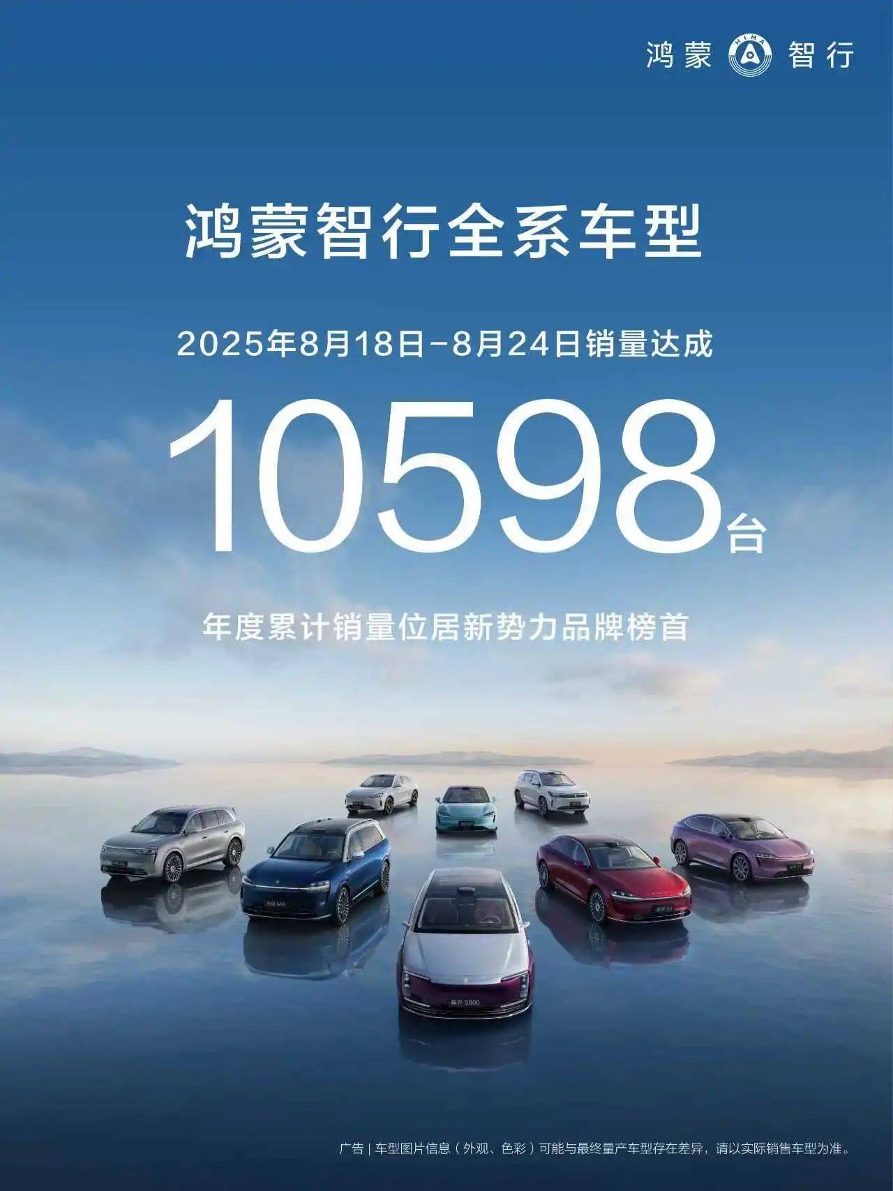 鸿蒙智行:2025年第34周周销量10598台 年度累计销量位居新势力品牌榜首