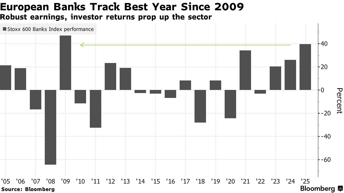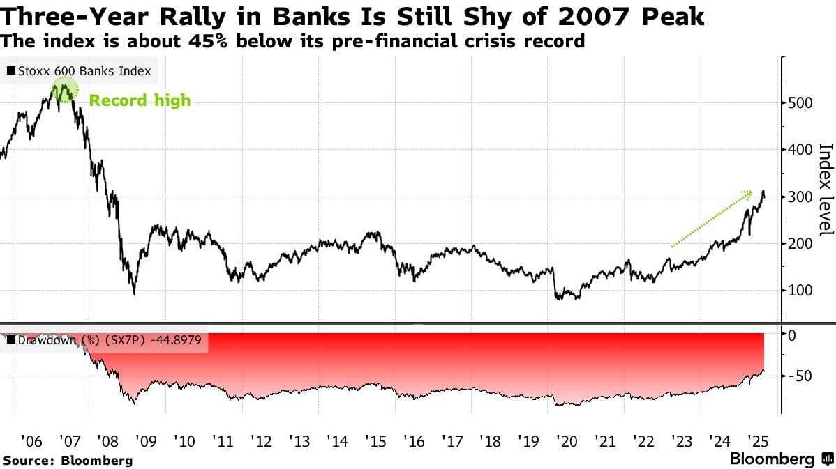 值得注意的是,当前欧洲银行股指数较2007年金融危机前峰值仍低约45%,连续第三年的上涨行情尚未触及历史高位。这一估值落差与政策风险、主权债务担忧的博弈,将成为决定板块后续走势的关键变量。