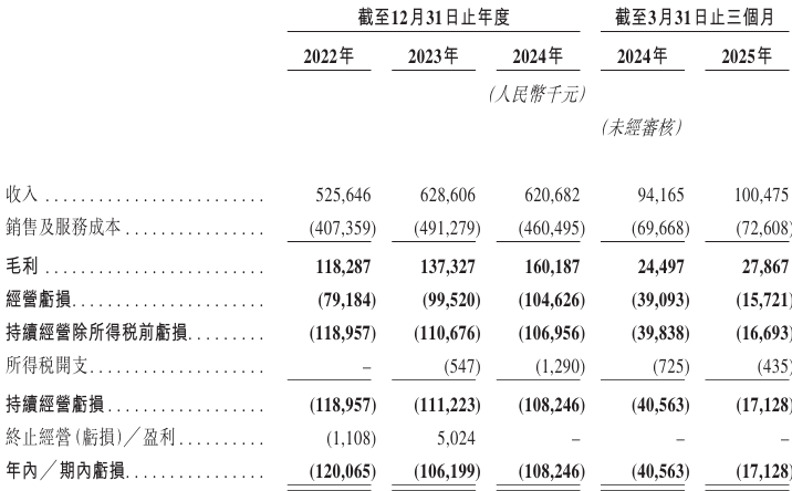 财务方面,于2022年、2023年、2024年及2025年截至3月31日止三个月,该公司收入分别约为5.26亿元、6.29亿元、6.21亿元、1亿元人民币;同期,年内/期内亏损约为1.20亿元、1.06亿元、1.08亿元、1712.8万元人民币。