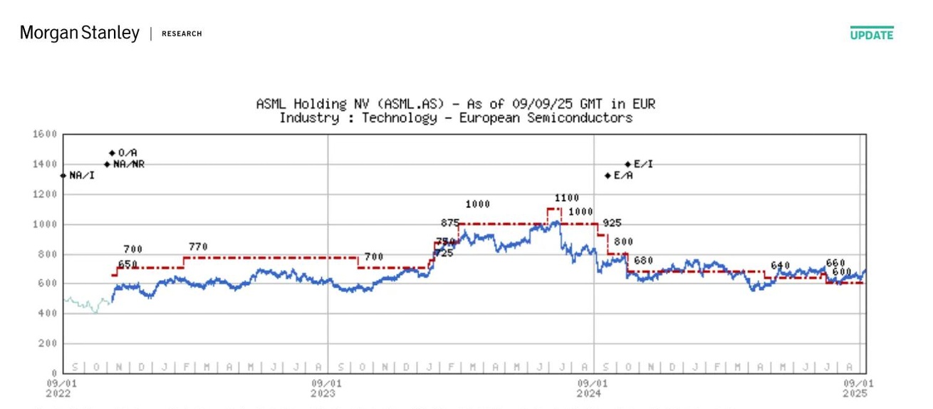 更重要的是,大摩分析师团队在这份研报中维持对于阿斯麦股票的“持股观望”评级,对于阿斯麦未来12个月的目标股价则维持在600欧元这一看跌点位。相比之下,阿斯麦股价自上周以来,在“High-NA从实验室验证走向与芯片制造端部署”以及投资Mistral AI共同催化之下,显著迈入上行轨迹,当前在欧洲股市徘徊于685欧元/股附近。在美股市场,阿斯麦美股ADR(ASML.US)自8月以来涨超16%,近7个交易日的累计涨幅更是高达10%,徘徊于805美元/股附近。