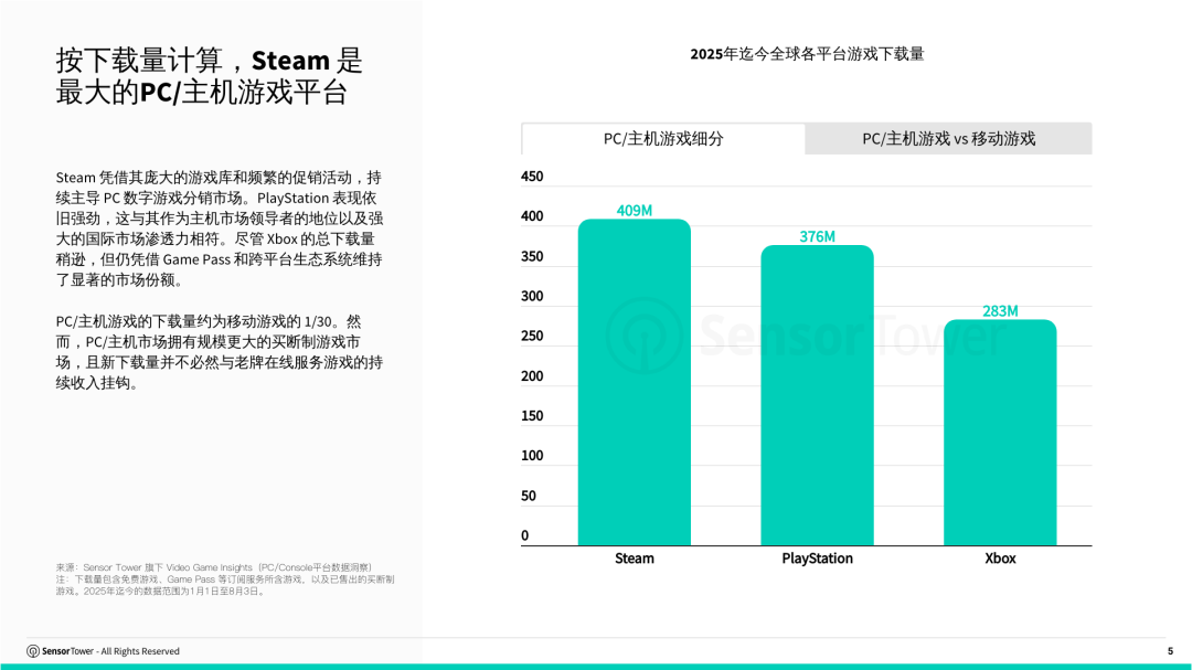 智通财经APP获悉,9月17日,SensorTower发文称,2025年,PC/主机游戏下载量已超10亿次,Steam凭借其在PC平台的主导地位占据最大份额。PlayStation紧随其后,Xbox仍占据相当市场份额。