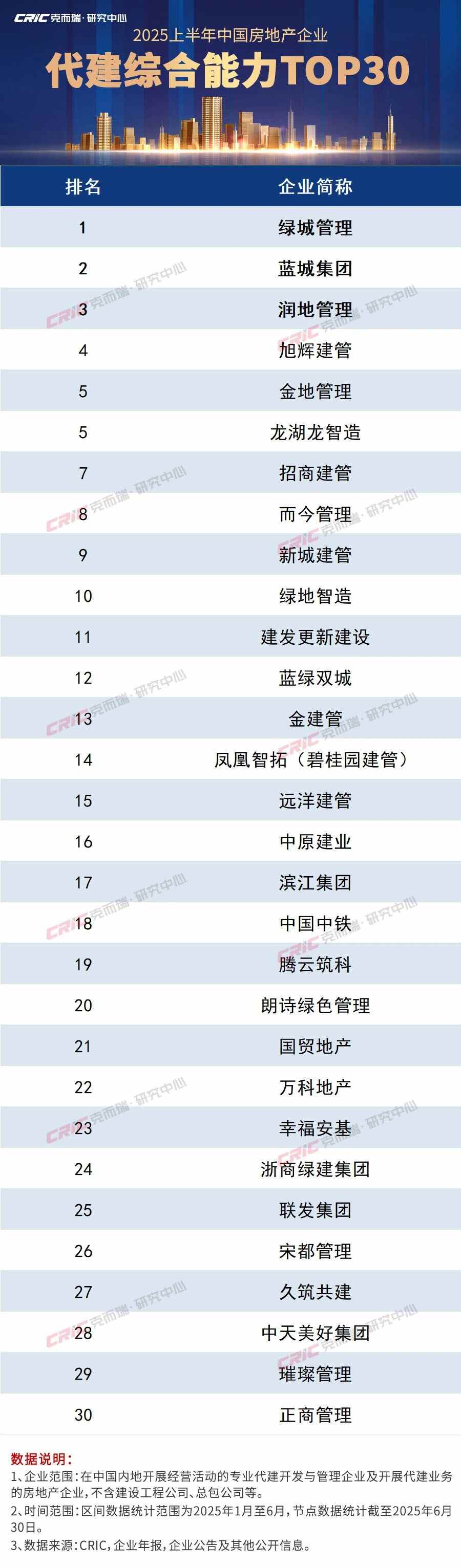 从2025年上半年中国房地产企业代建综合能力TOP30来看,有三个方面值得关注: