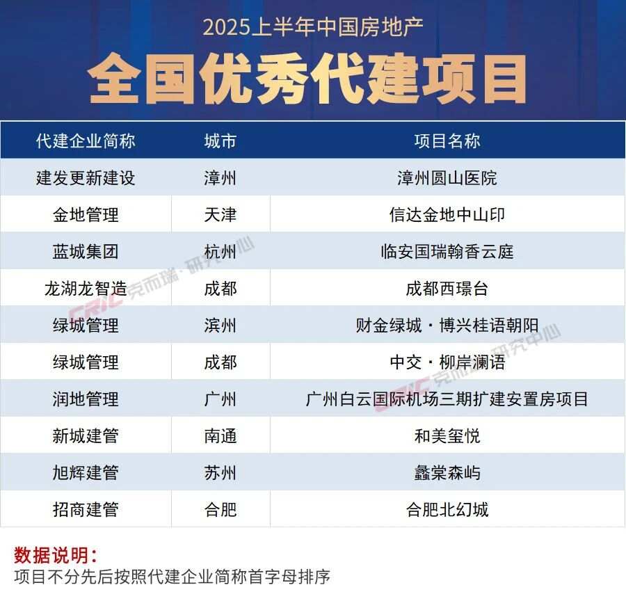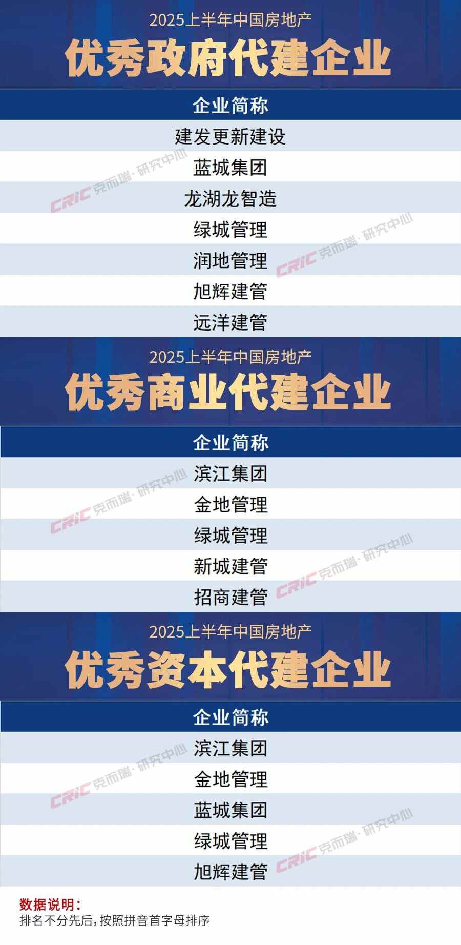 首先,具有先发优势的老牌代建企业保持稳定、高效的发展节奏。从代建综合实力排名来看,深耕代建领域多年的绿城管理、蓝城集团、润地管理位居前三。2025年上半年三家代建企业在业务规模、品牌效应、管理优势、市场认可度等方面均较为突出。