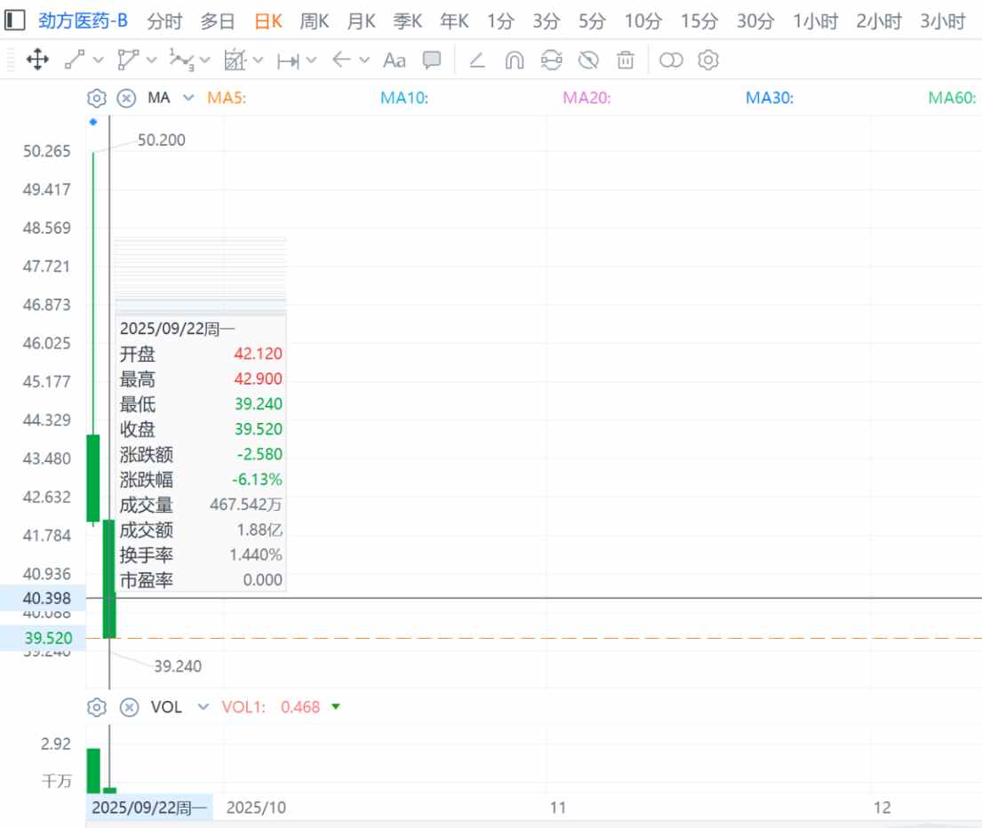 但较发行价翻倍的涨幅叠加当日冲高回落的表现,同样也导致劲方医药在上市首日出现较大的场内分歧,不少投资者选择“落袋为安”。但在9月22日,劲方医药在收跌6.13%的情况下,场内出现明显“惜售”,当日成交量从上市首日的3491.35万股断崖跌至473.66万股。