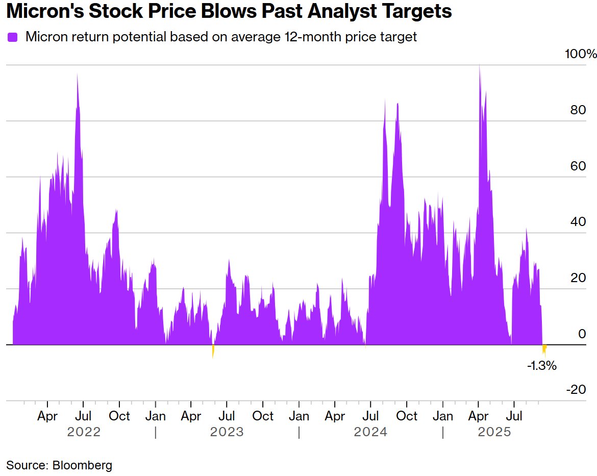 美光股价周一收于164.62美元,略高于华尔街162.46美元的12个月目标价,这表明近80%给予"买入"评级的分析师并不预期从现在起有太大上行空间。