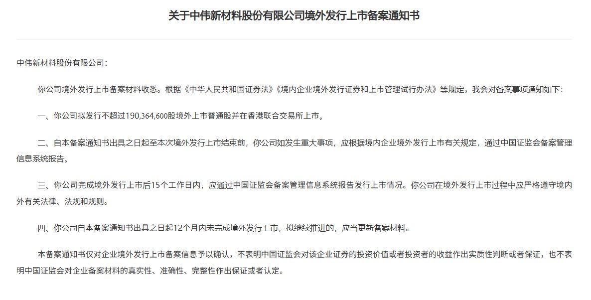 智通财经APP获悉,9月26日,中国证监会国际合作司发布《关于中伟新材料股份有限公司境外发行上市备案通知书》。中伟股份(300919.SZ)拟发行不超过190,364,600股境外上市普通股并在香港联合交易所上市。