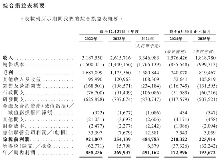 业绩方面,2022年、2023年、2024年及2025年截至6月30日止六个月,该公司实现收入分别约为31.88亿元、26.16亿元、33.47亿元及18.19亿元人民币;同期,年/期内利润约为8.58亿元、2.7亿元、4.91亿元及1.94亿元人民币。