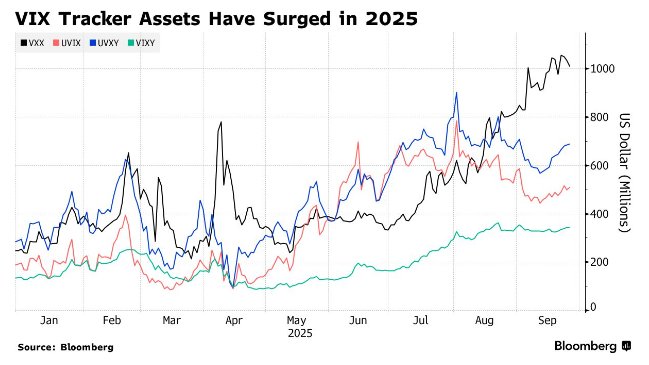 但持有这些工具的成本不容忽视。以UVIX(VIX相关ETF)为例,其公开费用率达2.8%,且目前该ETF持有10月和11月到期的两份VIX期货合约。基金每天都会卖出部分10月合约、买入11月合约,直至10月合约到期;随后,11月合约的持仓又会逐步转向12月合约,依此类推。
