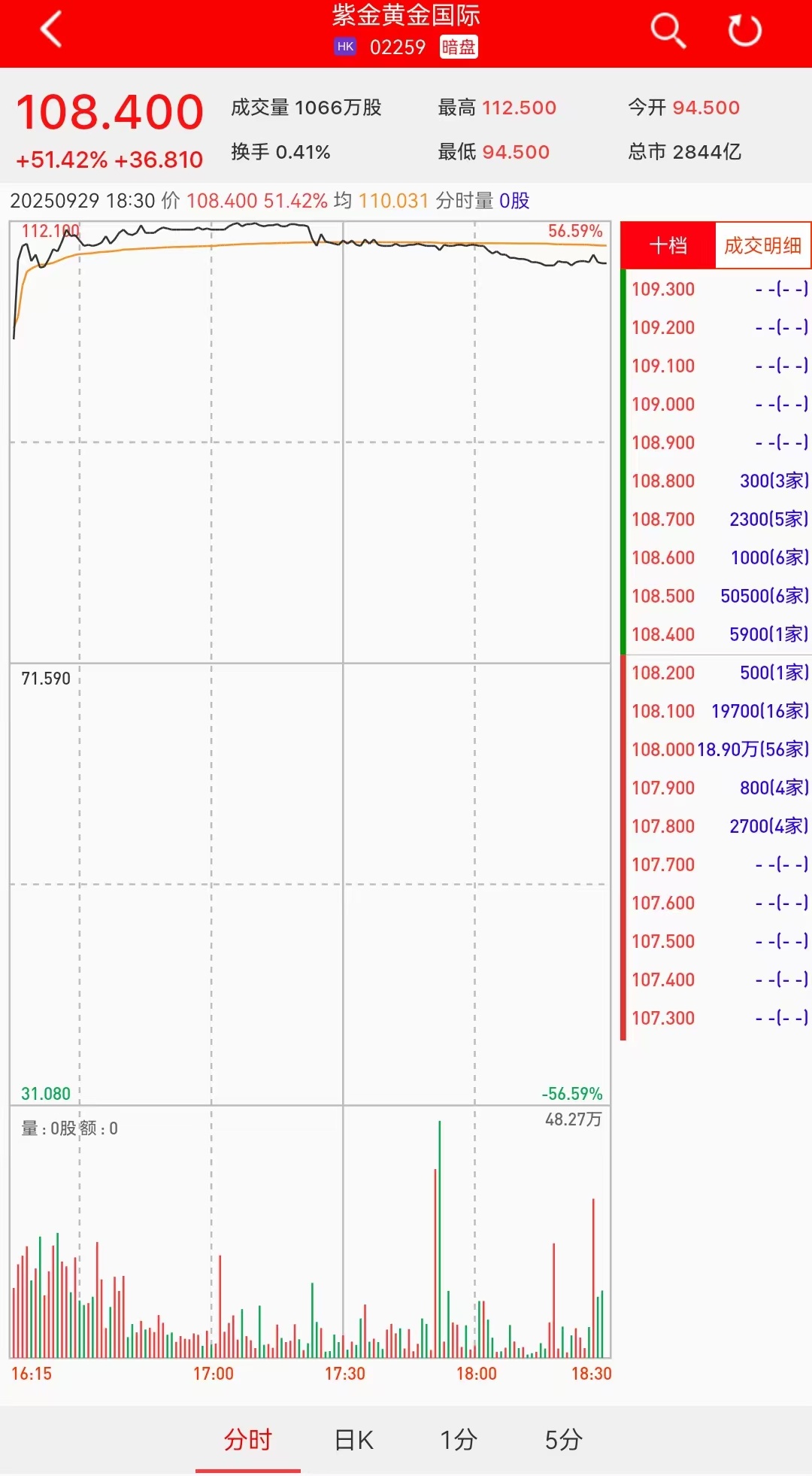 智通财经APP获悉,紫金黄金国际(02259)将于9月30日(周二)在香港挂牌。截至收盘,利弗莫尔证券暗盘交易显示报价108.40港元,较招股价71.59港元上涨51.42%,每手100股,不计手续费,每手赚3681港元。