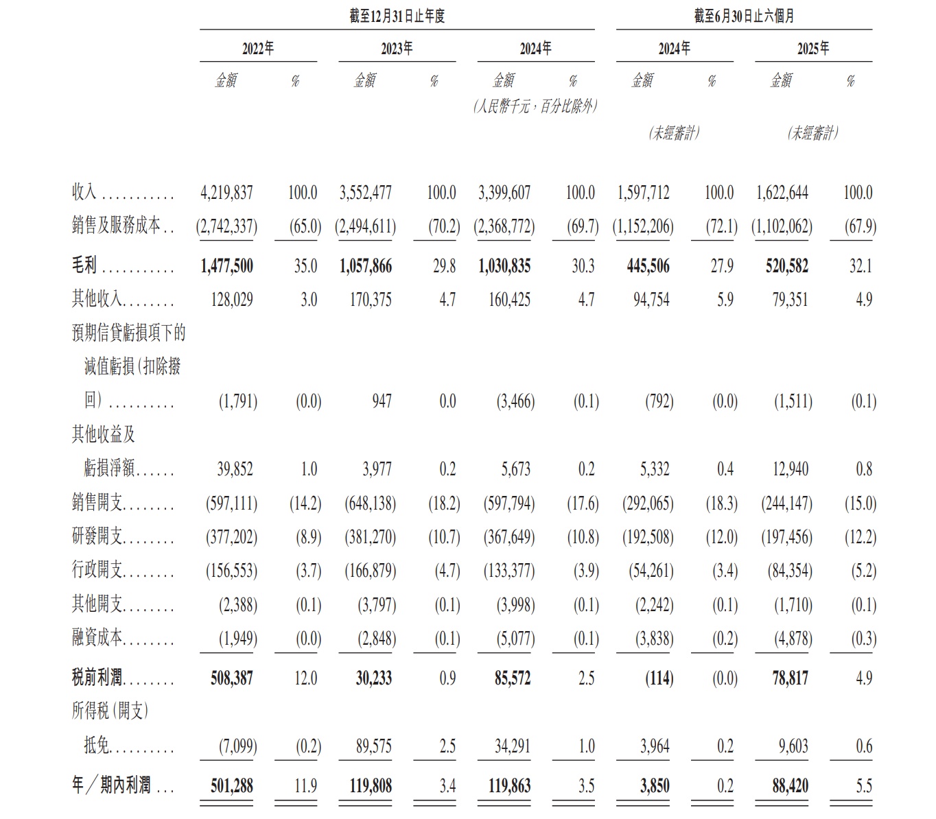 财务方面,于2022年度、2023年度、2024年度、2025年截至6月30日止六个月,该公司收入分别约为42.20亿元、35.52亿元、34.00亿元、16.23亿元人民币;同期,年/期内利润约为5.01亿元、1.20亿元、1.20亿元、0.88亿元人民币。