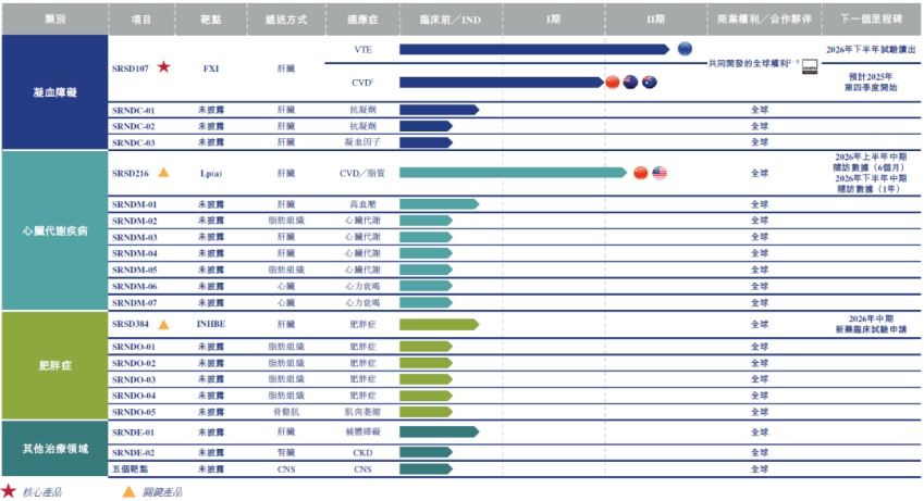 目前公司已经建立起丰富且具差异化竞争优势的产品管线,并拥有了一款核心品种——用于治疗凝血功能障碍疾病的FXI siRNA(SRSD107),以及两款重磅品种Lp(a) siRNA(SRSD216)、INHBE siRNA(SRSD384),分别、用于治疗心脏代谢疾病、肥胖症。