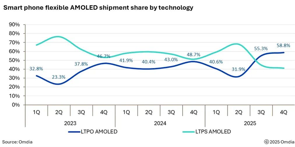 这一向LTPO的转型正值柔性AMOLED巩固其作为智能手机显示屏市场主流技术的地位。2024年,AMOLED显示屏的总出货量首次超过TFT LCD,占智能手机显示屏总出货量的51%。值得注意的是,在柔性AMOLED细分领域中,高端设备对低功耗的需求正推动从LTPS向LTPO的特定转型。根据面板制造商下半年的出货计划,LTPO的份额预计将在2025年第三季度达到55.3%,并在第四季度增长至58.8%。