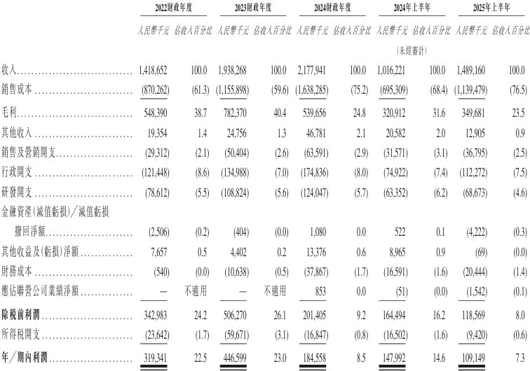 业绩方面,2022年、2023年、2024年及2025年上半年,该公司实现收入分别约为14.19亿元、19.38亿元、21.78亿元、14.89亿元人民币;同期,年度/期内利润约为3.19亿元、4.47亿元、1.85亿元、1.09亿元人民币。