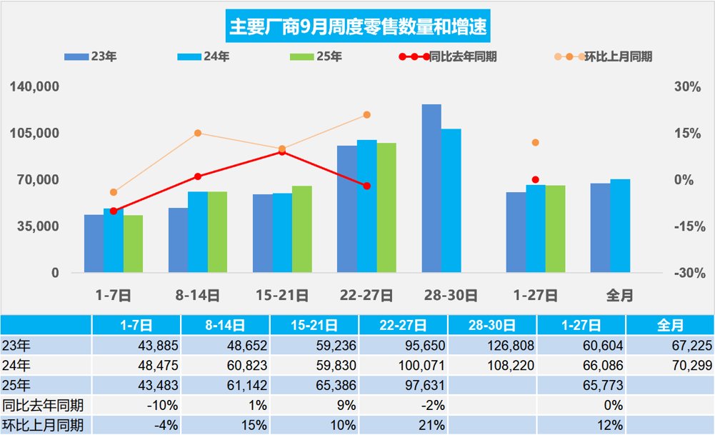 9月第四周全国乘用车市场日均零售9.8万辆,同比去年9月同期下降2%,较上月同期增长21%。