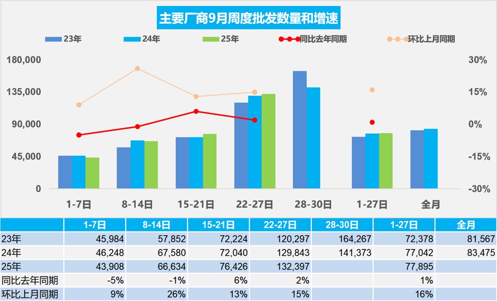9月1-27日,全国乘用车厂商批发210.3万辆,同比去年9月同期增长1%,较上月同期增长16%;今年以来累计批发2,014.5万辆,同比增长12%。