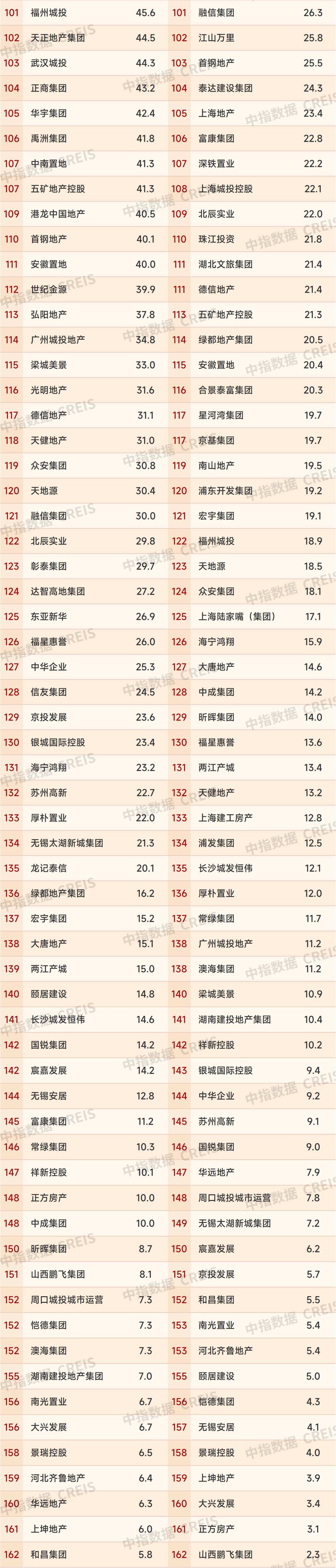 2025年1-9月,各阵营房企销售额均有下降。其中,TOP10房企销售额均值为1280.9亿元,较上年下降11.2%;TOP11-30房企销售额均值为319.8亿元,较上年下降14.9%;TOP31-50房企销售均值为156.5亿元,较上年下降9.8%;TOP51-100房企销售额均值为74.6亿元,同比下降12.9%。