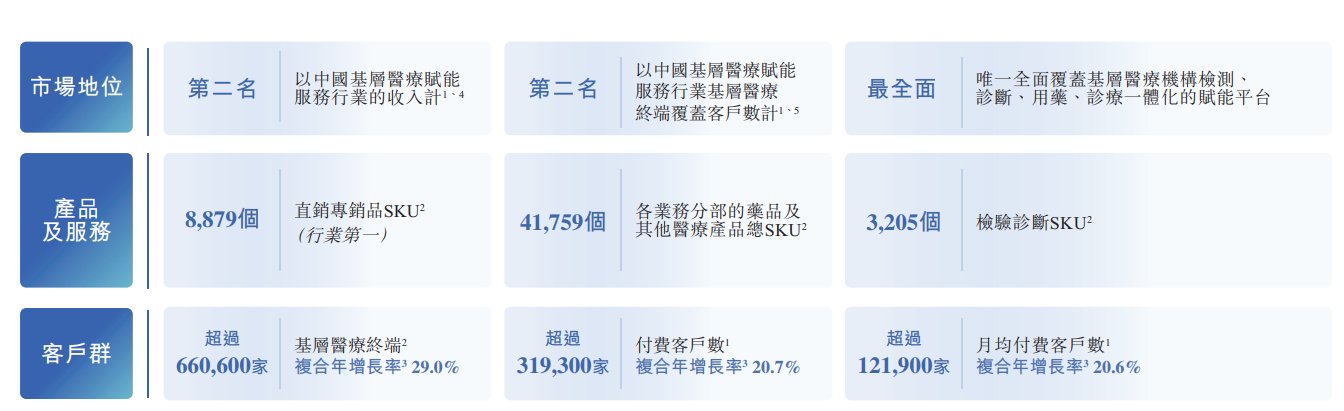 根据灼识咨询的资料,以2024年收入计,公司在中国基层医疗赋能服务行业排名第二。截至2024年12月31日,以基层医疗终端客户(包括(i)涵盖村卫生站、门诊部及诊所的基层医疗机构,及(ii)涵盖单体药店及中小连锁药店的基层药店)数量计,好医生云医疗于中国基层医疗赋能服务行业中位列第二。公司亦是中国基层医疗行业唯一一家以数智化与AI辅助赋能的综合赋能平台,为基层医疗机构提供包括检验、诊断、用药及诊疗一体化在内的业务场景全覆盖解决方案。