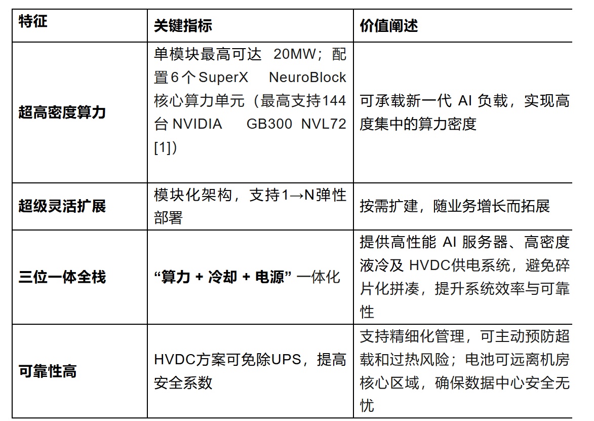 超高密度: 方案的核心算力单元 SuperX NeuroBlock最高支持24台NVIDIA GB300 NVL72,功率高达3.5MW,为传统方案的7倍[2]。通过与高密度液冷和HVDC供电系统的深度耦合,实现了高度的算力密度,同算力密度下占地面积大幅度减少,从而在更小的物理空间内释放更澎湃的算力。
