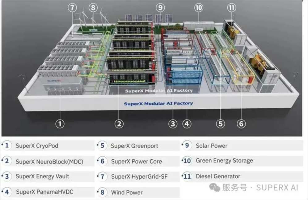 SuperX模块化AI工厂,其创新点在于将算力、冷却、电源高度集成,变“复杂定制”为“标准化产品”,实现即插即用。20MW的单模块占地预计仅需6,000㎡,可按需扩建,以“搭积木”的建设方案可无限扩张增加算力。