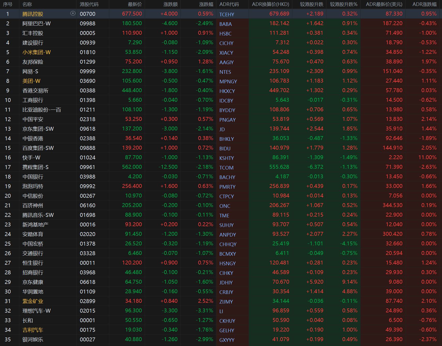 大型蓝筹股多数上涨,汇丰控股收报111.281港元,较香港收市涨0.34%;腾讯控股收报679.689港元,较香港收市涨0.32%。