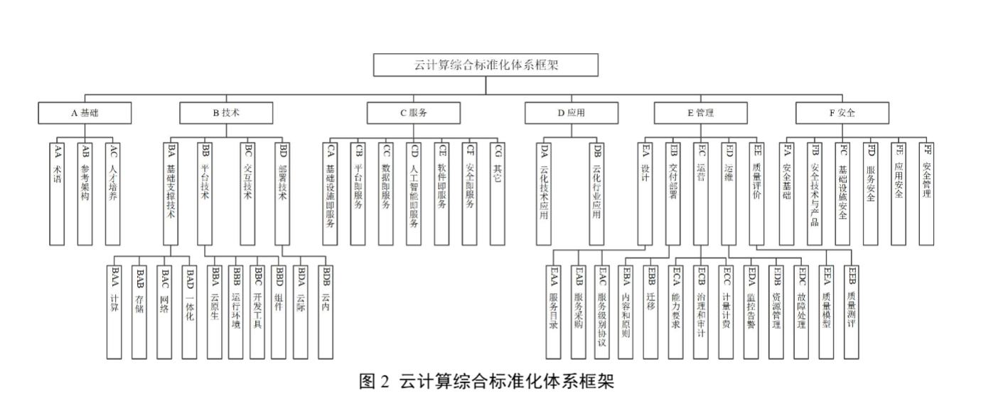 (二)云计算综合标准化体系框架云计算标准体系框架主要由基础、技术、服务、应用、管理和安全6个部分组成,如图2所示。