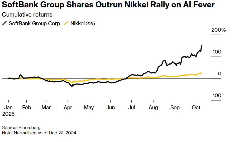在甲骨文与软银共同合作提供主权云与AI算力服务,以及软银计划收购ABB集团机器人业务的消息提振市场对软银人工智能业务利润增长的预期,再加之全球资金对于AI算力产业链投资情绪持续升温,软银股价周四在日本股市一度涨超13%再创历史新高,年内涨幅高达150%,大幅跑赢日经225指数。在美股市场,软银集团ADR(SFTBF.US)交易价格今年以来同样屡创新高,2025年迄今涨幅高达140%,大幅跑赢纳斯达克100指数。