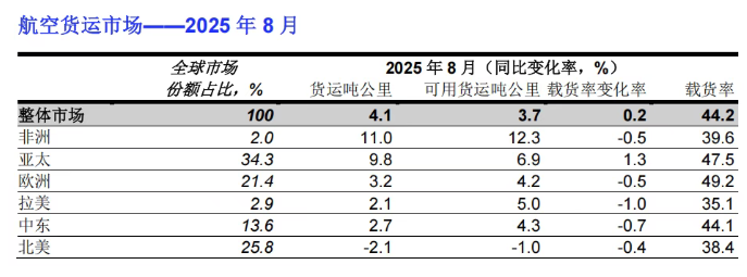 北美航空公司8月航空货运需求同比下降2.1%,在所有地区中增长最慢。运力同比下降1.0%。