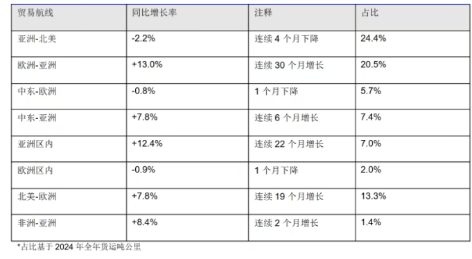 贸易通道增长:2025年8月,大多数主要贸易通道的航空货运量大幅增长。欧洲-亚洲和亚洲区内实现了强劲的两位数增长,而中东-亚洲、北美-欧洲和非洲-亚洲也实现了显著增长。相比之下,亚洲-北美、中东-欧洲和欧洲区内的需求有所下降。