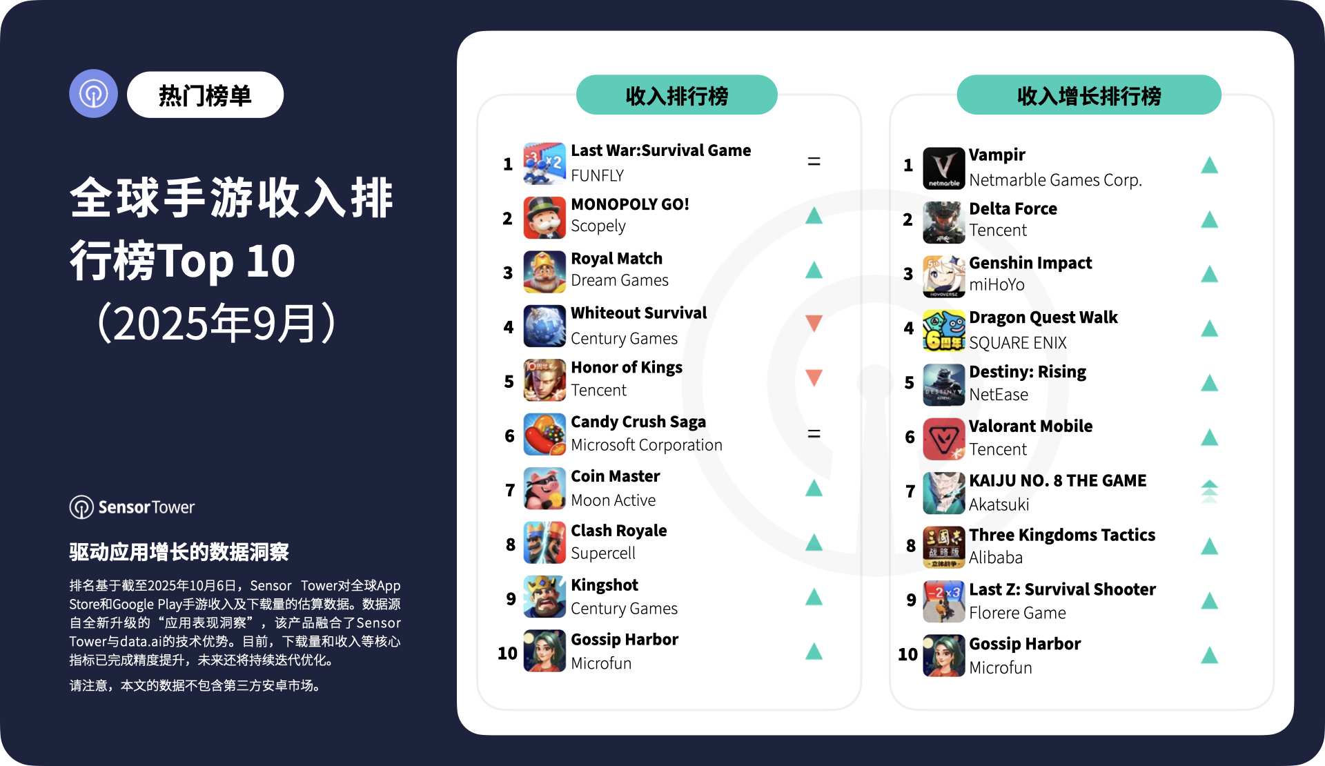 智通财经APP获悉,Sensor Tower发布2025年9月全球手游收入与下载量排行榜TOP10。《Last War: Survival