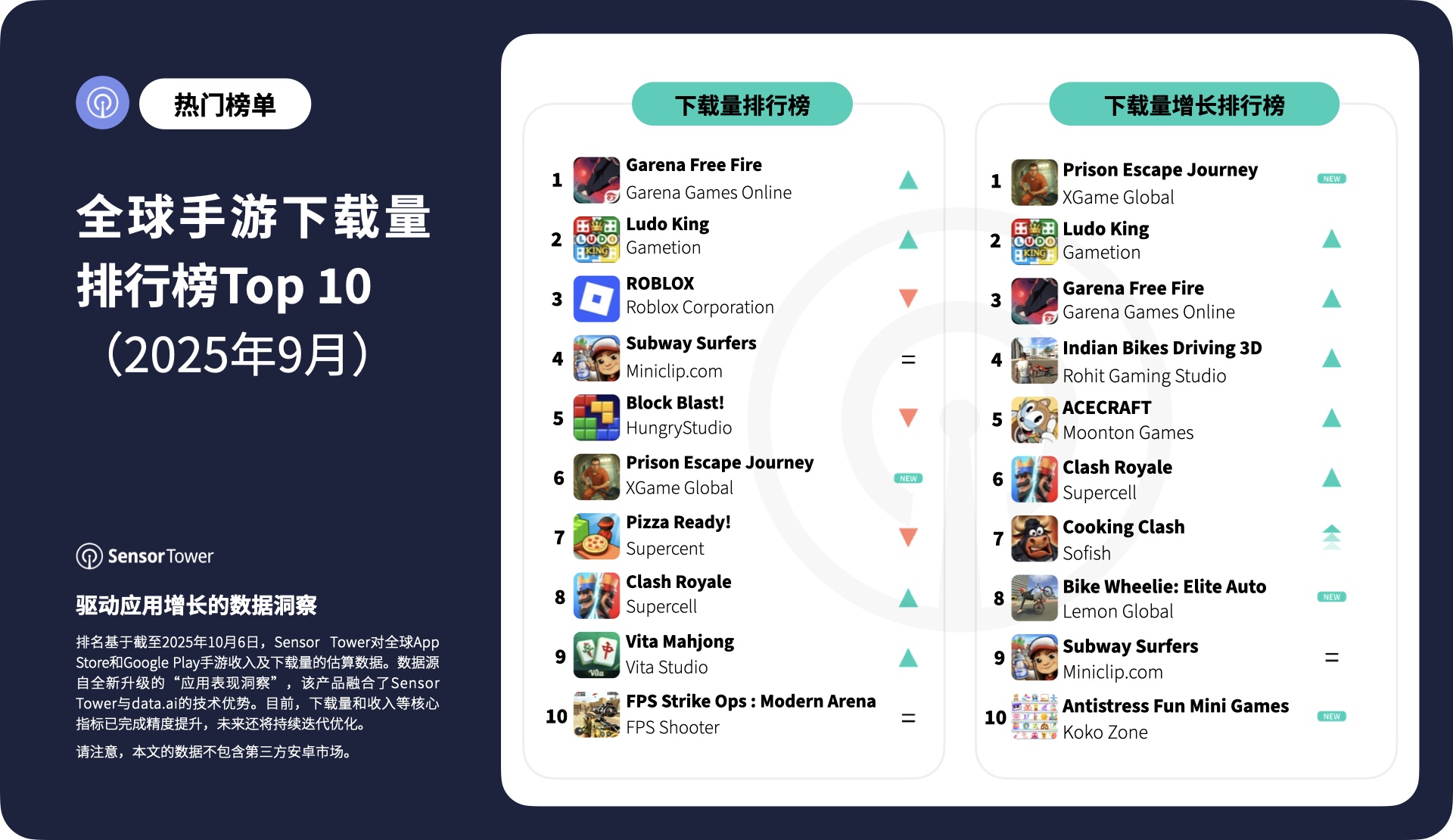《Ludo King》登顶2025年9月全球手游下载榜。《Free Fire》稳居第2位,《ROBLOX》、《Subway Surfers》和《Block Blast!》紧随其后,共同跻身前五。