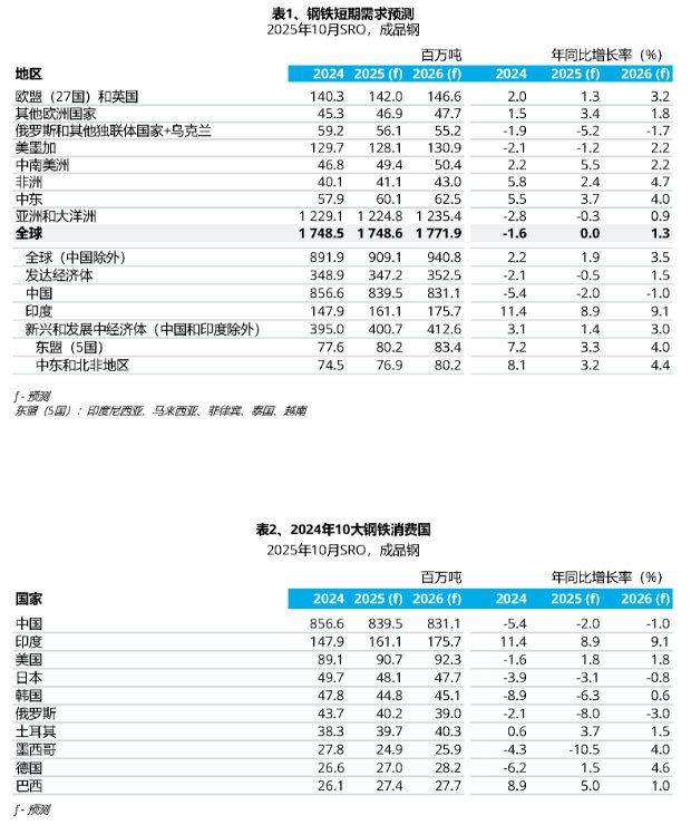中国之外发展中国家的钢铁需求预计将实现稳健增长,2025年增长3.4%,2026年增长4.7%。其主要驱动因素来自印度以及部分东盟和中东北非国家的强劲表现。
