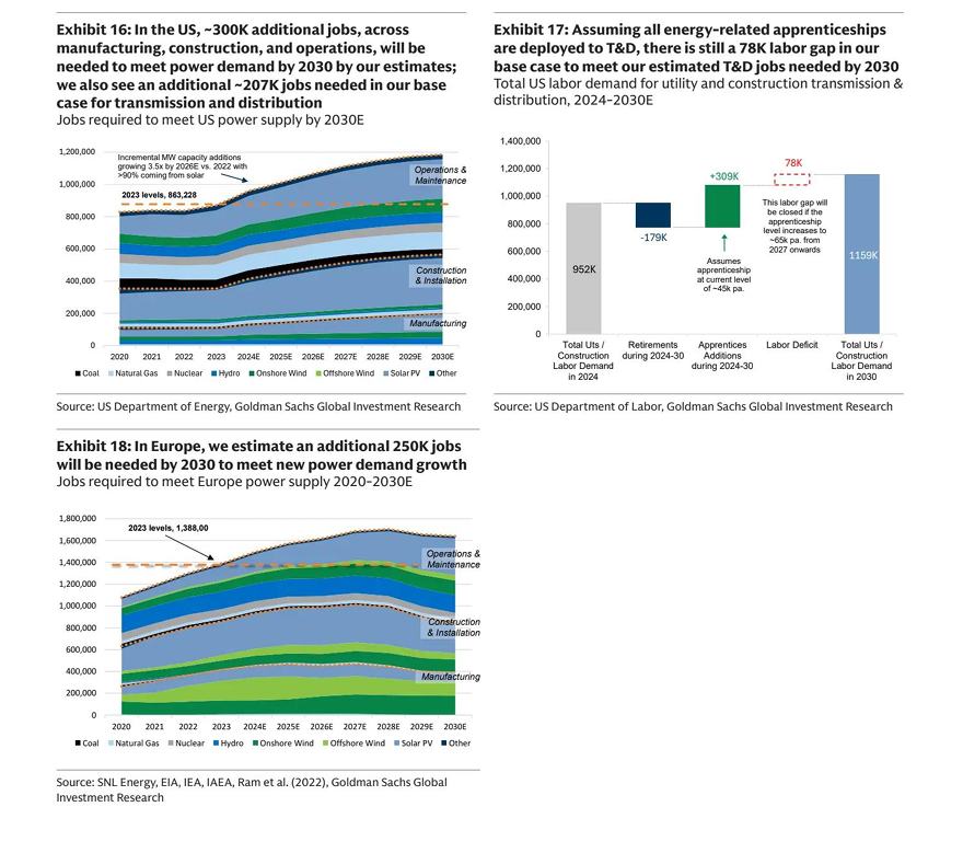 Parts(设备供给)以及People(建设与运维劳动力)方面,高盛分析师团队表示,劳动力缺口仍然是全球电力市场的重大风险:预计美国到2030年电力相关新增岗位大约30万,T&D(输配电)另需大约21万;欧洲则需电力岗位大约25万。高盛预计至2030年美国电网方面的累计资本开支约7900亿美元(高于高盛此前预期的约7800亿美元),预计大约67%投向输配电/配网层面的强化举措。