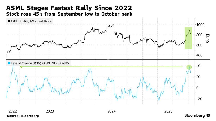 阿斯麦是制造最先进制程AI芯片所必需的EUV光刻机设备的全球唯一供应商,曾在7月表示由于全球贸易摩擦,无法确认2026年的业绩增长预期,这一表态曾令其股价在财报公布日当天下挫11%,并拖累芯片板块同行们。此后,美国与欧盟之间的一项协议将包括半导体设备在内的战略物项免于关税,这为其美国客户下单扫清了一个罩顶阴云,叠加全球AI基础设施建设浪潮如火如荼,持续推高阿斯麦等半导体设备商股价。。