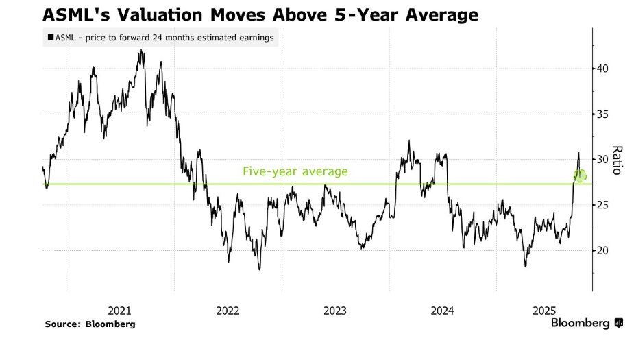 对投资者们而言,经历近期强势上涨后,阿斯麦估值已不再显得便宜。按两年期限的远期每股收益估值——由于其先进EUV设备交付周期长,这是一项关键指标,该股远期市盈率已升至28x,高于过去五年27x的平均水平。