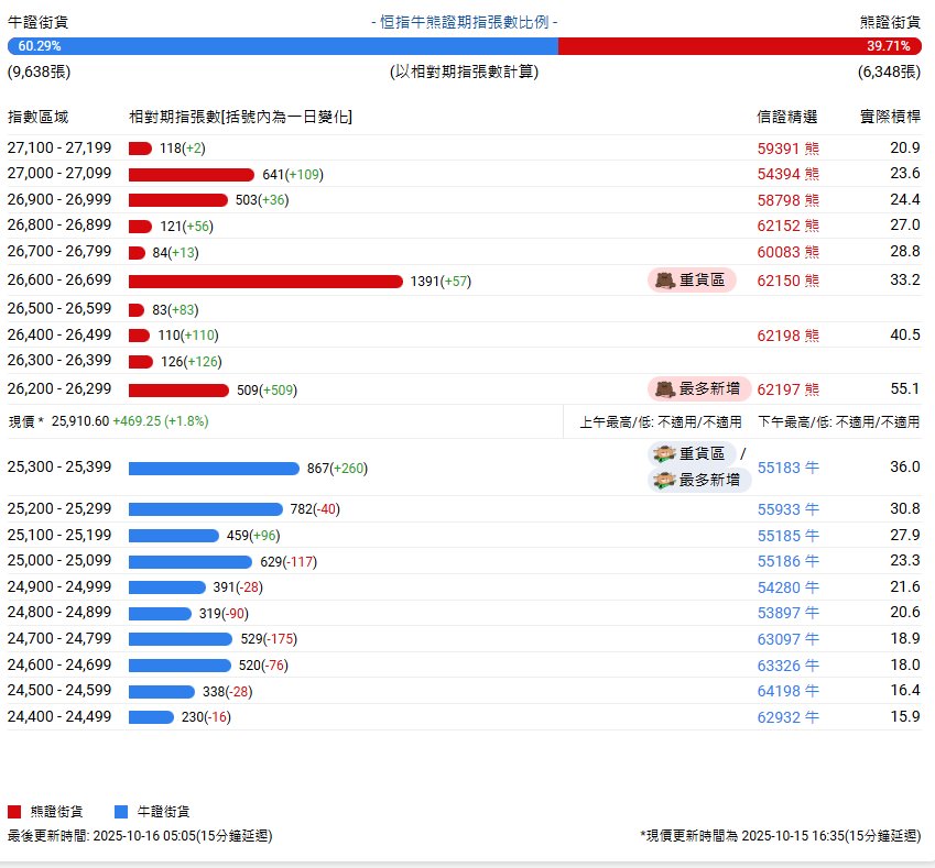 智通财经APP获悉,截至10月16日,恒指最新的牛熊街货比例为60:40。