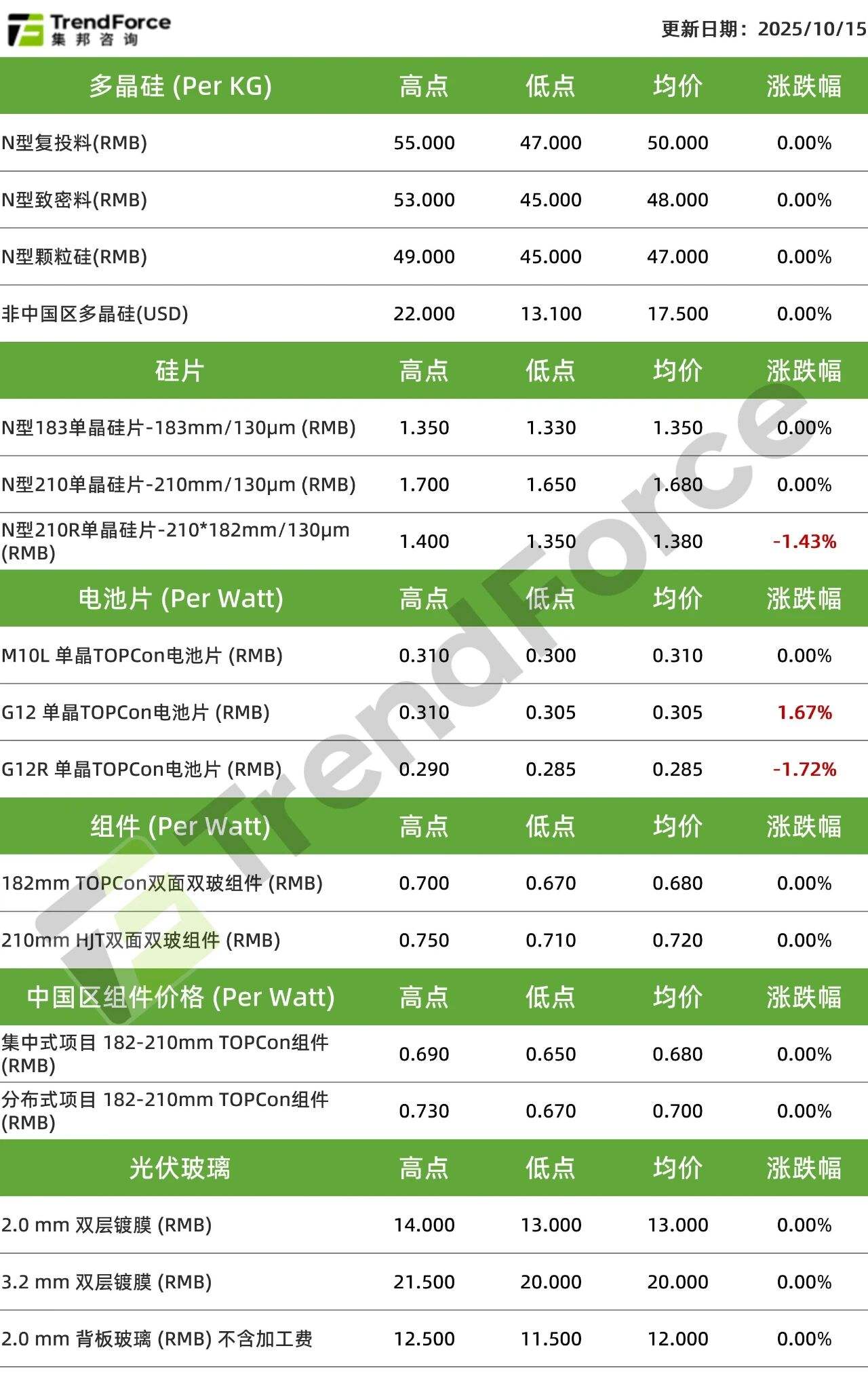 智通财经APP获悉,TrendForce发文称,光伏产业链在反内卷政策下,尽管短期供需关系不佳,但价格有望企稳。其中多晶硅环节、硅片环节及电池片环节受到政策调控,预计本月价格将保持高位持稳。组件环节受终端需求疲软影响,整体价格上涨乏力。后续仍需重点关注反内卷政策推进落地效果,政策或继续主导行业价格走势。