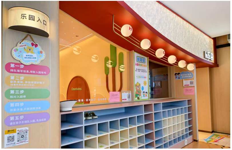 在游乐园入口的右手边,是一整排鞋柜,用于摆放进园人员脱下的鞋子。据了解,为保持游乐园的清洁,以及防止游玩时打滑摔倒,海底捞亲子友好店要求进入游乐园的儿童,必须穿着防滑袜。据门店负责人介绍,游乐园设备设施还全面软包防滑垫,以保证入园儿童的安全。