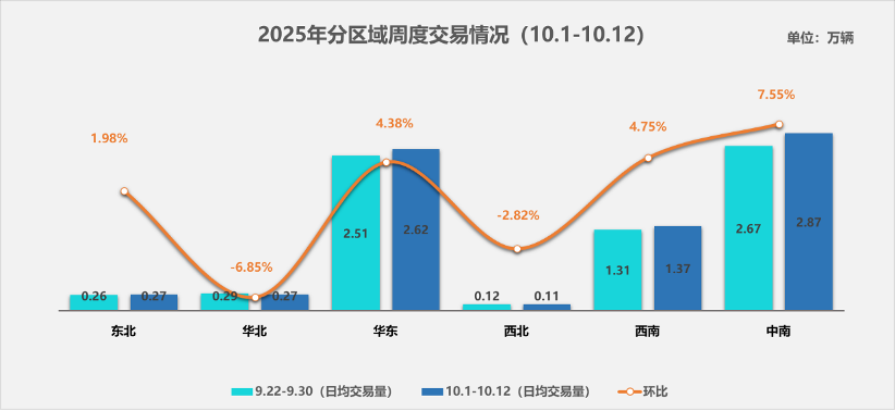 本周,二手车市场整体展现出稳健的增长态势。具体到各区域市场的表现,东北、华东、西南以及中南地区均呈现出交易量攀升的良好势头;相比之下,华北和西北地区本周的需求稍显疲软,交易量出现了小幅度的下滑。