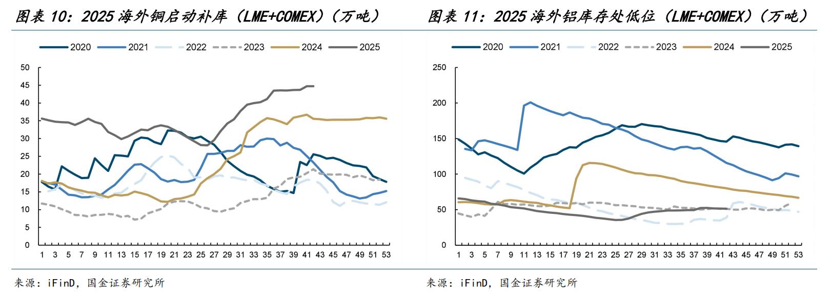 在本轮补库周期中,铜价同样受到补库逻辑支撑,具体体现为美国市场因232关税影响所开启的补库进程,并在今年上半年完成行情演绎,不过相较于铜,小金属板块因弹性更高,阶段性表现更为突出。进入下半年,随着市场对降息的预期从反复博弈走向最终确认,黄金作为典型的金融属性品种,其价格走势显著走强;与此同时,铜价在补库逻辑基础上进一步叠加供应端突发事件的扰动,价格表现持续向好。