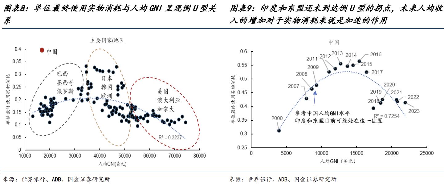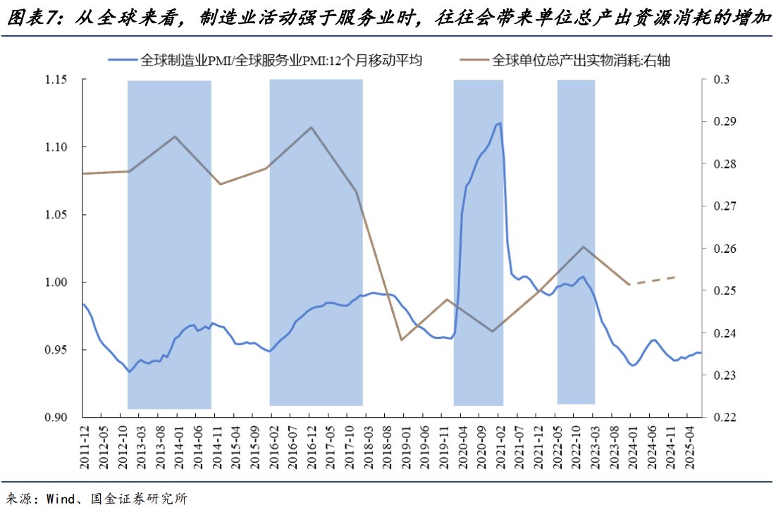 中期维度下,全球产能的转移与重建或将从生产和需求两端带来单位GDP实物消耗的上升。从历史经验来看,获得投资越多的国家,人均收入均得到了明显的正向扩张,而人均收入与单位最终使用实物消耗呈现倒U型关系。背后逻辑在于:当人们生活水平较低时往往只能满足基本的生存需求;随着人均收入的提高,人们开始有能力消费制造业产品,例如汽车、家电等,而制造业产品往往蕴含着更多的实物消耗;当人均收入水平进一步提高时,人们可能会将多余的收入转向服务型消费,从而单位最终使用实物消耗开始下降。而当前主要新兴国家的人均最终使用实物消耗仍处于较低位置,因此在全球降息周期已开启的背景下,全球产业链转移和新兴市场产能建设或将进入加速阶段,不仅直接带来投资性需求,亦将通过人均收入提升催生更多的消费需求,形成“投资-消费”的共振扩张,预计未来1-2年全球制造业周期修复有望成为资源品需求的重要支撑力量。
