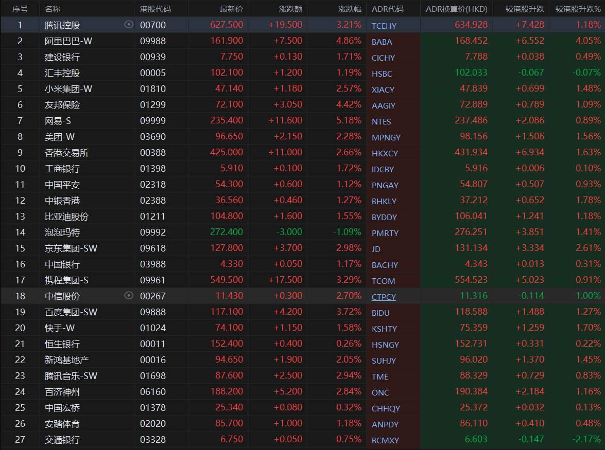大型蓝筹股多数上涨,汇丰控股收报102.033港元,较香港收市跌0.07%;腾讯控股收报634.928港元,较香港收市涨1.18%。