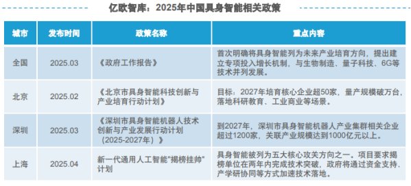 2025年,中国政府首次将“具身智能”写入政府工作报告,标志着其正式上升为国家战略,成为未来产业培育的重点方向。随后,北京、深圳、上海、杭州等重点城市迅速响应,密集出台配套政策,围绕技术攻关、产业集群建设与应用场景开拓等多方面加大扶持,具身智能机器人领域政策红利不断释放。