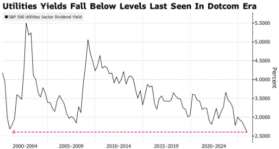 目前投资者似乎并未对公用事业股进行投资,原因也在于其股息。该板块的股息收益率已降至约 2.6%,低于互联网泡沫破裂时期的水平。收益率下降是因为股价上涨速度过快,以至于投资者突然要付出高昂的成本才能买入这些股票。